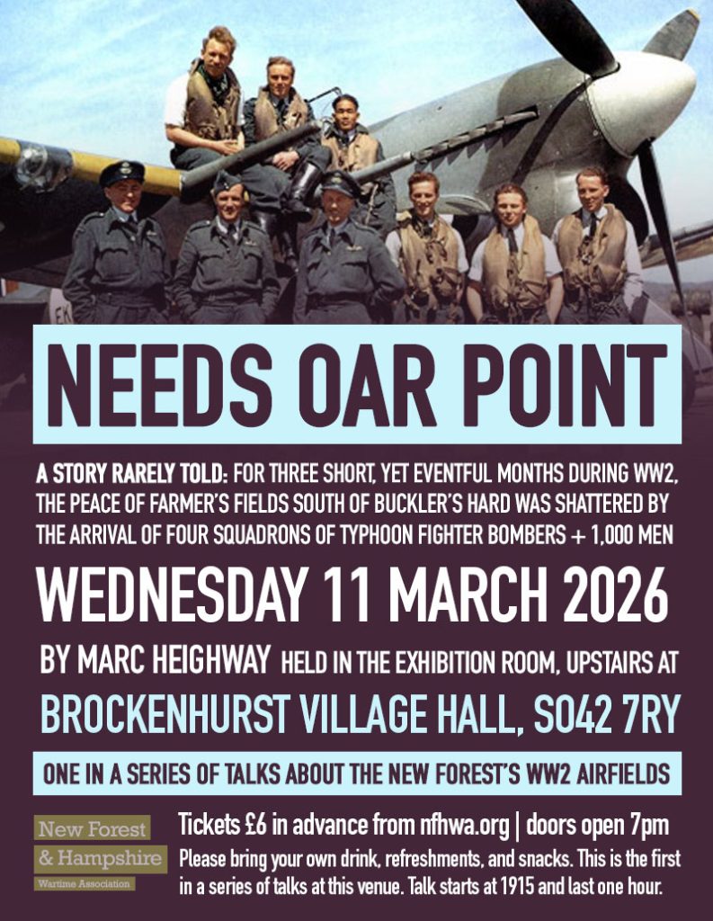 Marc Heighway explains how for just three short, yet eventful months in WW2, the peace of farmer’s fields south of Buckler’s Hard was shattered by the arrival of four squadrons of Typhoon fighter bombers and lorries full of men. Some have said that this was the busiest airfield on D-Day. But just how true is this? Marc investigates the stories of Needs Oar Point and shows how agricultural land near Park Farm and St Leonards was converted into a wartime airfield. The story of RAF Needs Oar Point is one that has rarely been told despite the role it played in wartime. The talk includes never before seen photography and film, tales of bravery, inspiring stories, and how tragedy and high casualty rates struck the young men who flew from these local fields of green.