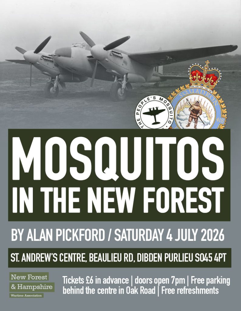 Alan Pickford from The People’s Mosquito charity presents the stories of the New Forest pilots who flew the Mosquito, including tales of 418 (RCAF) Squadron based at RAF Holmsley South. He will also explain how Mosquitos were constructed at the Airspeed factory at Christchurch.