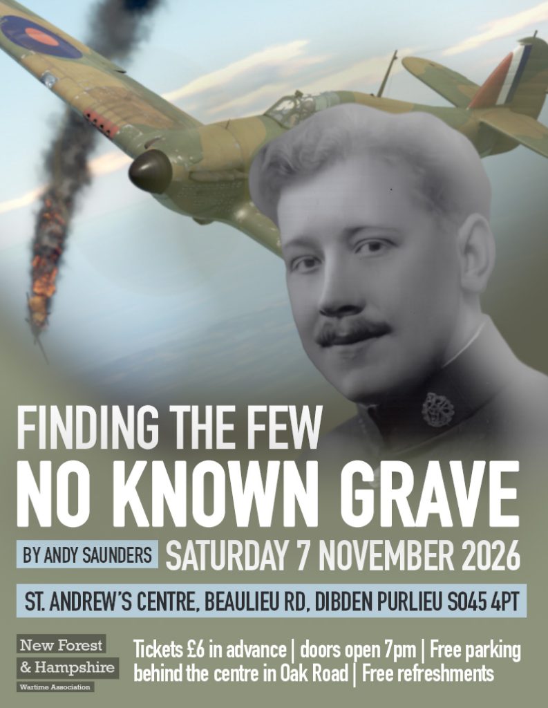 This talk by Andy Saunders focusses on the story of Sgt ‘Paddy’ Adair of 213 Squadron, RAF Tangmere, who was shot down and killed over Hampshire on 6 November 1940 when his Hurricane crashed on the downs at Widley. He was posted as ‘missing in action’. He has no known grave and is commemorated on the CWGC memorial at Runnymede to ‘missing’ RAF aircrew who were lost over NW Europe during the Second World War.